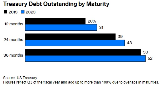 近年来,国债的到期日越来越短,因此,几乎三分之一的国债需要在未来12个月内展期——很可能是在新的更高利率下。这还不包括为填补更大赤字而额外发行债券。在当前季度,净借款达到1万亿美元。