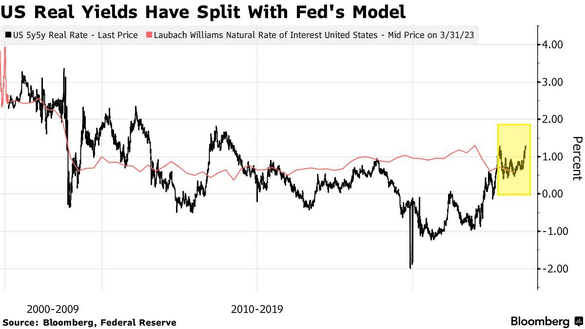从其中一个指标方面来看,市场已经押注美联储在中性利率方面落后于美债收益率曲线。纽约联储衡量通胀调整后的R*的指标徘徊在0.6%左右,然而基于掉期的重要代理指标——经过通胀指标调整后的5年期收益率——已跃升至1%以上。