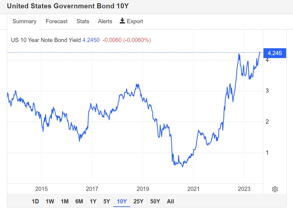 在周五亚洲市场的交易时间段,“全球资产定价之锚”稳定在4.24%左右。10年期美国国债收益率在本周二盘中曾短暂升破4.36%,续创2007年11月以来的新高。