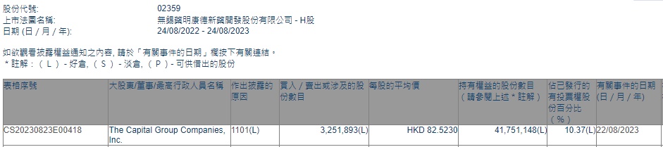 智通财经APP获悉,香港联交所最新资料显示,8月22日,美国资本集团增持药明康德(02359)325.1893万股,每股作价82.5230港元,总金额约为2.68亿港元。增持后最新持股数目约为4175.11万股,最新持股比例为10.37%。