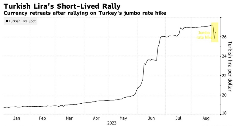 8月24日,土耳其央行将基准利率从17.5%上调750个基点至25%。这是土耳其央行6月回到加息周期后连续第三次加息,也是该周期幅度最大的一次加息。央行声明公布后,土耳其里拉对美元和欧元的汇率快速走高。美元兑土耳其里拉、欧元兑土耳其里拉均暴跌超5%,一度跌超6%。土耳其央行当天发表声明说,近期指标显示通货膨胀趋势持续增强,货币政策委员会决定继续执行货币紧缩政策。央行货币政策的中期目标是将通胀率降至5%,货币紧缩政策将根据需要及时、渐进加强,直至明显改变通胀预期。