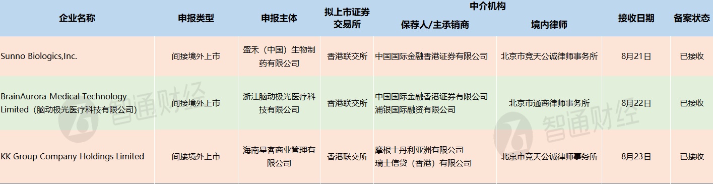 智通财经APP获悉,8月25日,中国证监会公布境内企业境外发行证券和上市备案情况表(首次公开发行及全流通)(截至2023年8月24日)。本周(8月21日-25日)共3家企业拟香港IPO获证监会接收材料,这三家企业分别为盛禾生物、脑动极光、KK集团。