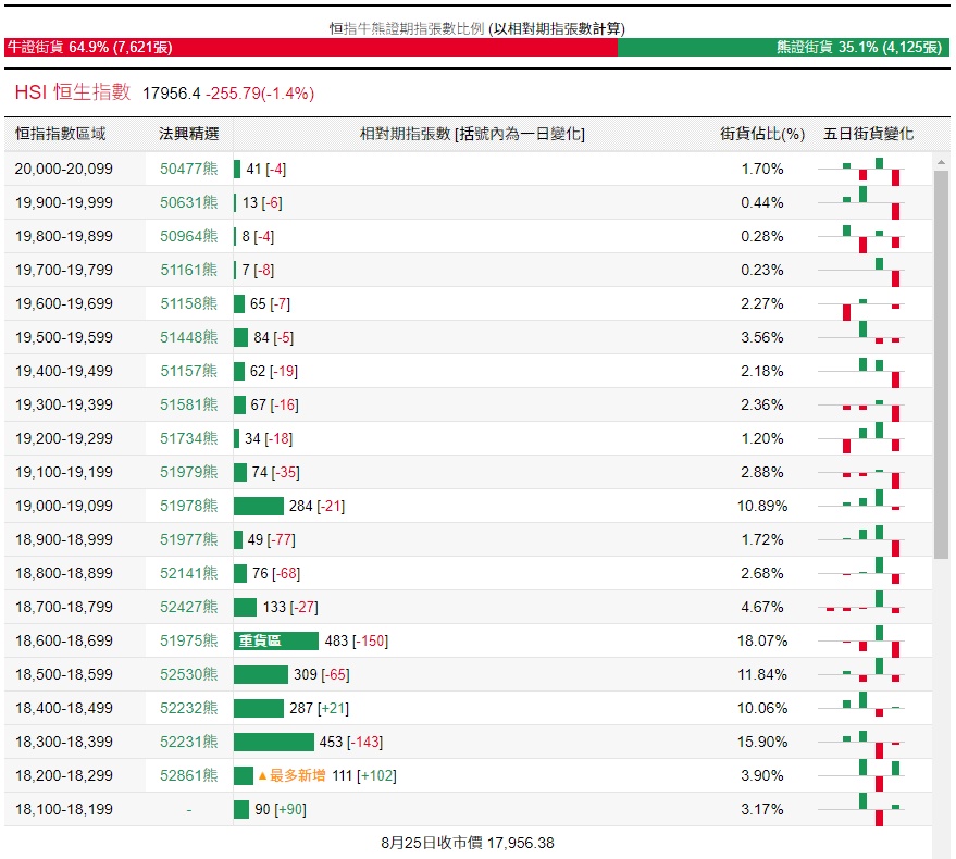 智通财经APP获悉,截至8月26日,恒指最新的牛熊街货比例为65:35。