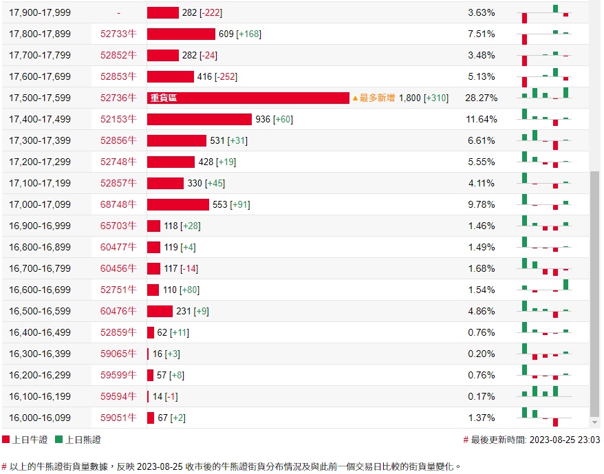 法兴恒指牛熊证街货分布图中的数据显示,熊证街货重货区在18600-18699区间,该区间最新熊证数量为483张,较上一交易日减少150张。最多新增在18200-18299区间,该区间最新熊证数量为111张,较上一交易日增加102张。