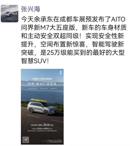 车展发布会后,赛力斯汽车董事长(创始人)张兴海在社交媒体表示:“今天余承东在成都车展预发布了AITO问界新M7大五座版,新车的车身材质和主动安全双超同级!实现安全性新提升,空间布置新惊喜,智能驾驶新突破,是25万级能买到的最好的大型智慧SUV!”