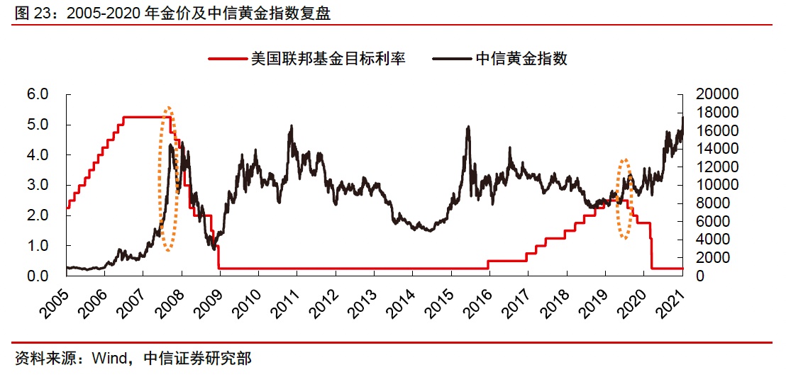 复盘历史,过去的二十余年里,美联储货币政策转为宽松的时间点前夕均是黄金板块的配置良机。