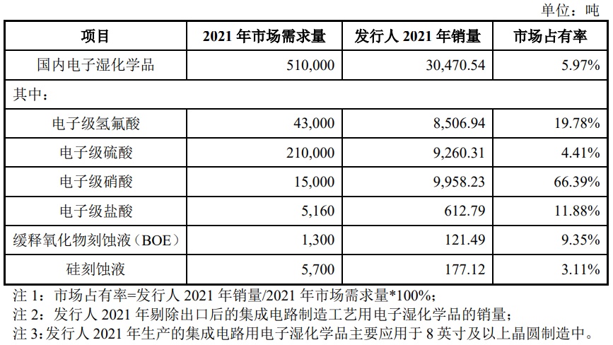 根据集成电路材料产业技术创新联盟(ICMtia)的数据,2021 年我国集成电路制造工艺用的电子湿化学品整体市场需求量达到 51 万吨,其中 2021 年集成电路制造工艺用的电子级氢氟酸、硫酸、硝酸、盐酸、硅刻蚀液、缓释氧化物刻蚀液等产品国内市场需求量,及发行人 2021 年集成电路制造工艺用的电子湿化学品的国内销量如下: