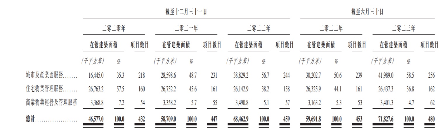 此外,公司的业务分为以下三个业务部门:城市及产业园服务、住宅物业管理服务、商业物业运营及管理服务。公司按分部划分的在管建筑面积及项目数目如下: