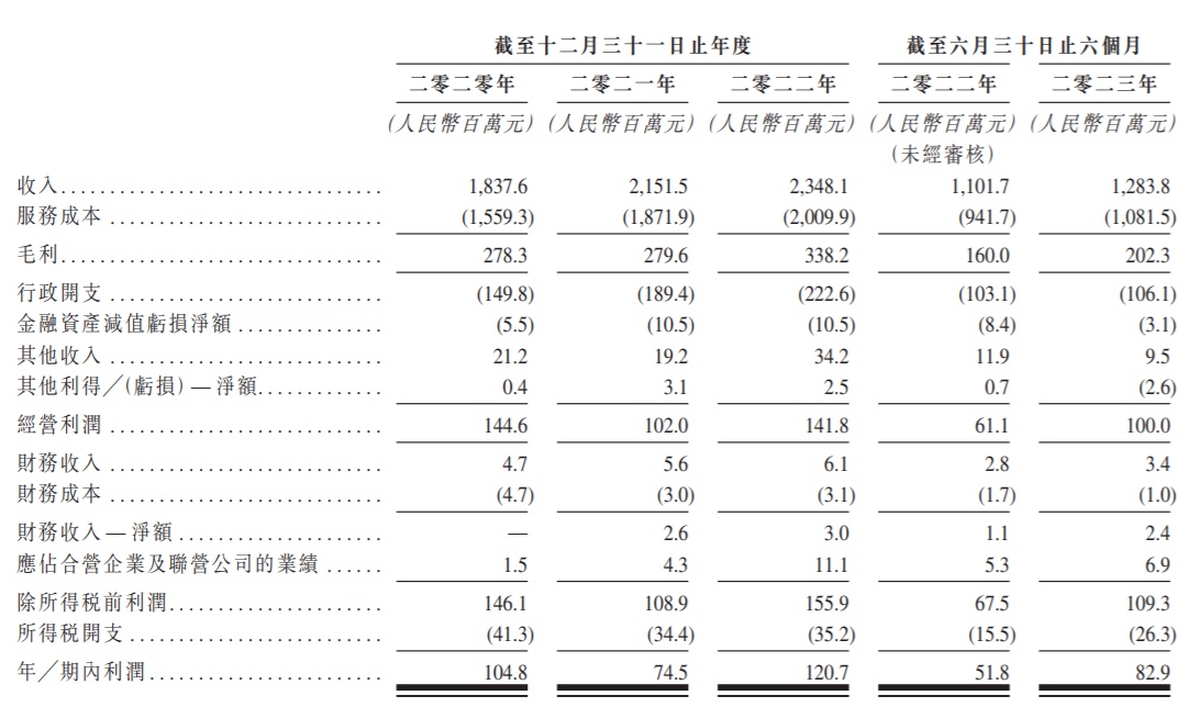 财务方面,于2020年度、2021年度、2022年度、2023年截至6月30日止六个月,深业物业实现营业收入分别约为18.38亿元人民币(下同)、21.52亿元、23.48亿元、12.84亿元。其中,公司实现净利润分别约为1.05亿元、0.75亿元、1.21亿元、0.83亿元。