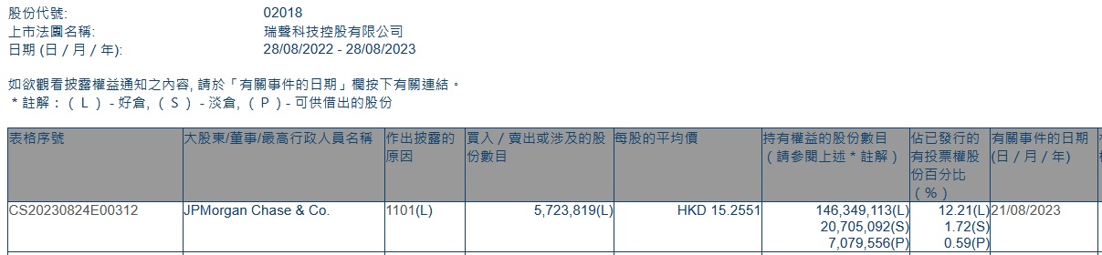 智通财经APP获悉,香港联交所最新资料显示,8月21日,小摩增持瑞声科技(02018)572.3819万股,每股作价15.2551港元,总金额约为8731.74万港元。增持后最新持股数目约为1.46亿股,最新持股比例为12.21%。