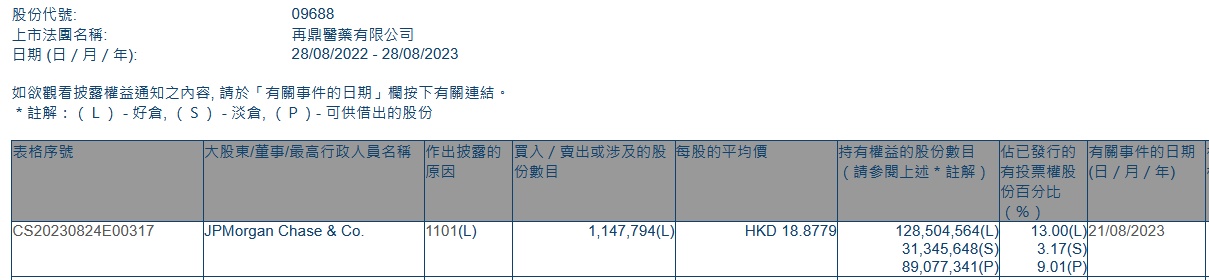 智通财经APP获悉,香港联交所最新资料显示,8月21日,小摩增持再鼎医药(09688)114.7794万股,每股作价18.8779港元,总金额约为2116.79万港元。增持后最新持股数目约1.29亿股,最新持股比例为13.00%。