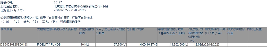 FUNDS增持昭衍新药(06127)6.77万股,每股作价16.3746港元,总金额约为110.86万港元。增持后最新持股数目为1430.26万股,最新持股比例为12.02%。