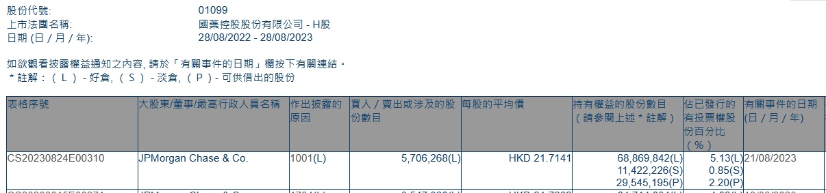 智通财经APP获悉,香港联交所最新资料显示,8月21日,小摩增持国药控股(01099)570.6268万股,每股作价21.7141港元,总金额约为1.24亿港元。增持后最新持股数目约为6886.98万股,最新持股比例为5.13%。