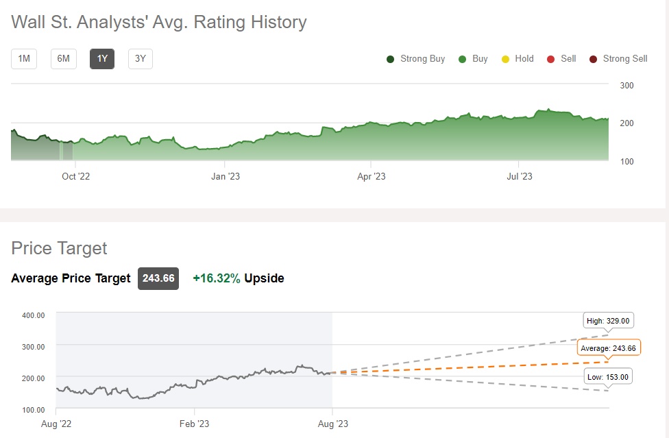总体而言,Seeking Alpha汇编华尔街分析师共识评级以及目标价,华尔街分析师们对赛富时的共识评级为“买入”,评级目标价为243.66美元,最高目标价达329美元。