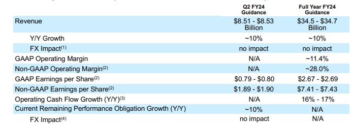赛富时预计第二财季cRPO增长 10%,意味着环比减少4.5亿美元。这与7月份的前三个季度形成鲜明对比,这三个季度cRPO环比增长分别为零、+9 亿美元和+7 亿美元。尽管第二财季明显环比下降,但这一预测似乎是可以实现的。值得注意的是,Salesforce 的预测基于 2024 财年具有挑战性的需求疲弱环境的假设,因此采取谨慎的态度,称他们的前景相当保守。