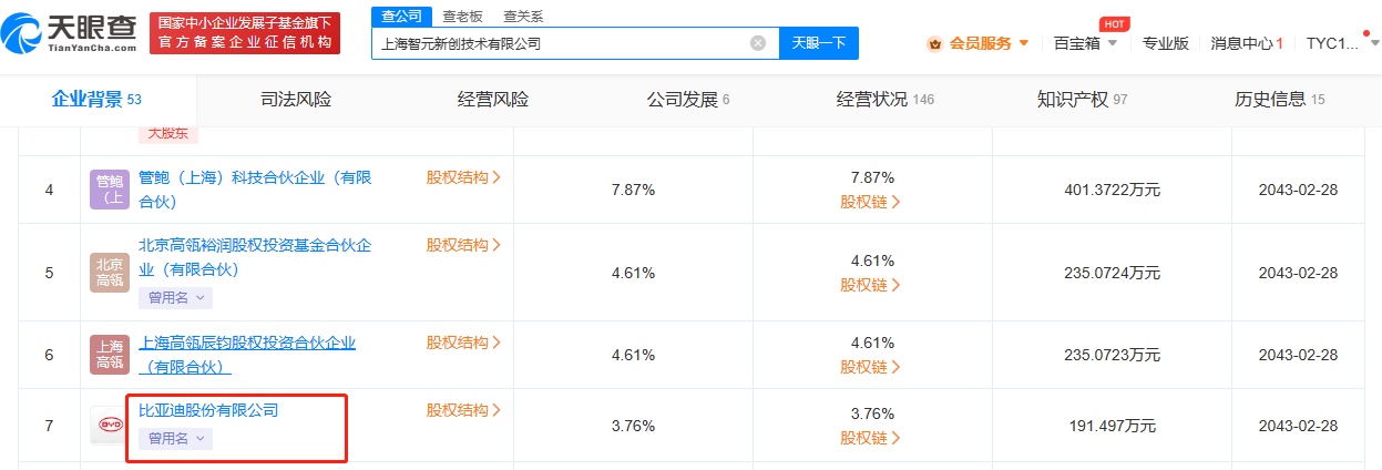 据公开资料显示,智元机器人成立于2023年2月,法定代表人为舒远春,经营范围含智能机器人的研发、人工智能理论与算法软件开发、人工智能硬件销售、电子产品销售等。目前,比亚迪持有智元机器人3.76%的股权,为该公司第7大股东。