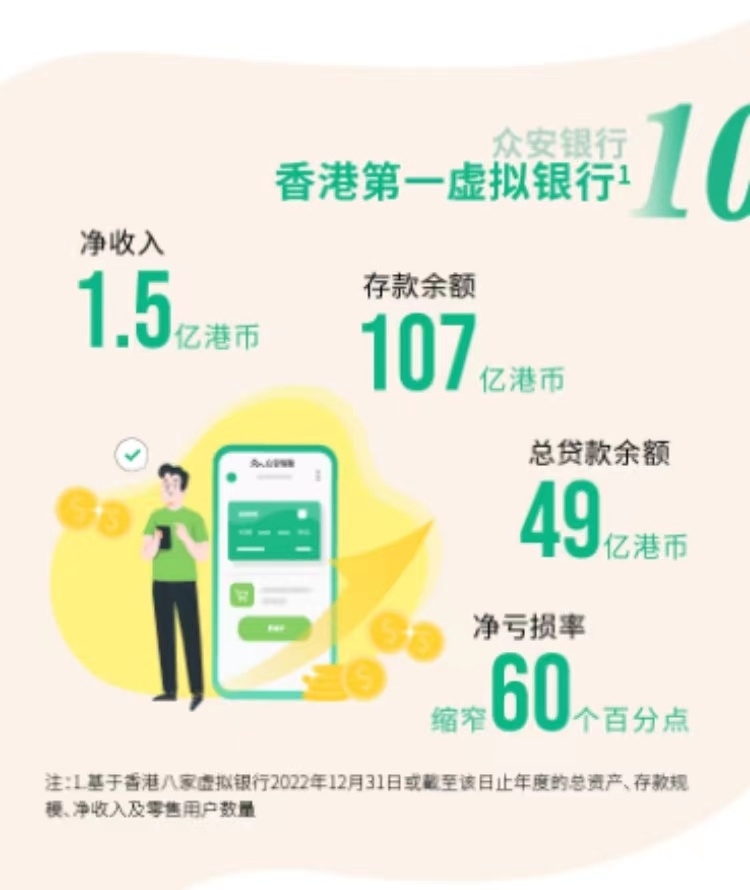 公告显示,集团银行分部:香港虚拟银行众安银行(ZA Bank)现处于业务发展早期阶段,产品功能不断丰富,用户变现进一步提升。同时,众安银行(ZA Bank)聚焦提升业务质量及运营效率,规模效应渐显。截至2023年6月30日,众安银行(ZA Bank)拥有存款余额约107.12亿港元,贷款总余额约49.16亿港元,存贷比为45.9%;同时,受益于加息周期以及贷款产品的不断丰富,众安银行(ZA Bank)净息差进一步提升至1.87%。于报告期内,随着新产品陆续上线,众安银行(ZA Bank)变现能力大幅提升,取得净收入约1.52亿港元,其中非息收入占比约25.8%;同时,众安银行(ZA Bank)聚焦业务质量、提升经营效率。