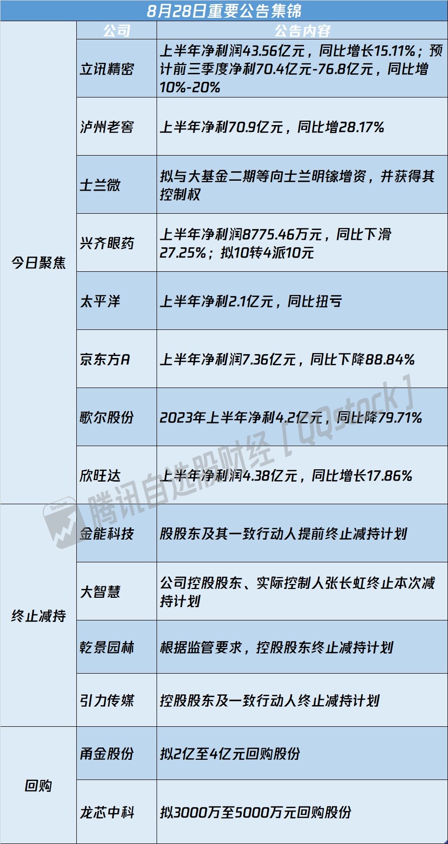 1、立讯精密:上半年净利润43.56亿元,同比增长15.11%;预计前三季度净利70.4亿元-76.8亿元,同比增10%-20%
