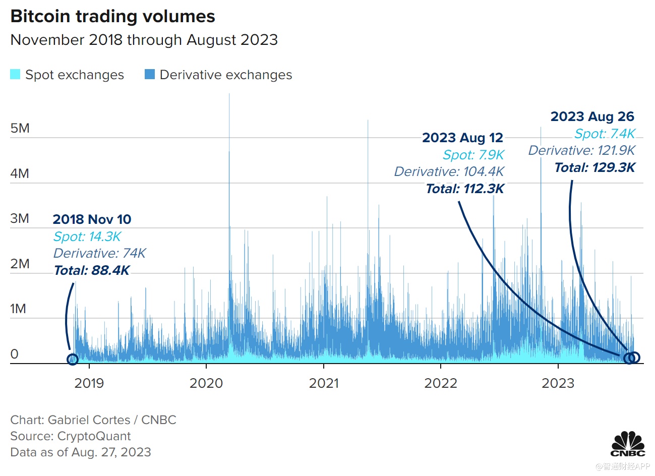 截至8月26日,所有交易所的比特币交易量为129,307。而在本月初的8月12日,该交易量曾跌至112,317,这是自2018年11月10日以来的最低水平。与3月份的350万相比,目前已下跌了约94%。