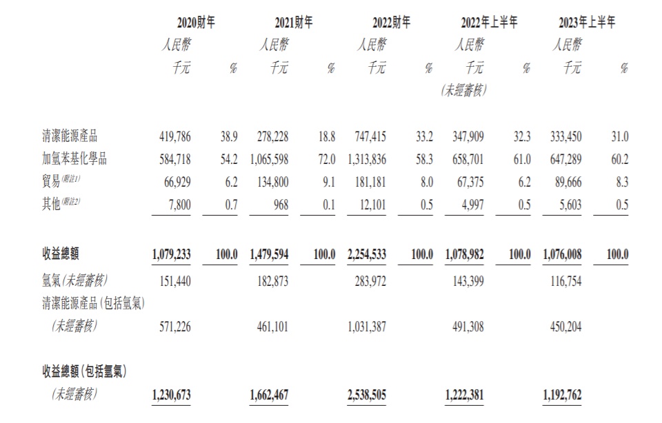 公司的主要产品包括清洁能源产品(液化天然气、煤气、氢气)和加氢苯基化学品,下表为按业务分部划分的收益明细: