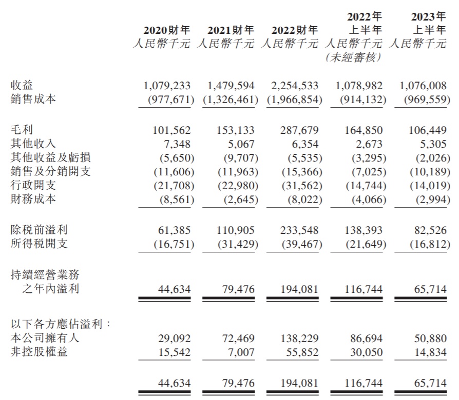 财务方面,于2020财年、2021财年、2022财年、2023年上半年,金源氢能实现收益分别约为10.79亿元人民币(下同)、14.80亿元、22.55亿元、10.76亿元。其中,公司实现净利润分别约为4463.4万元、7947.6万元、1.94亿元、6571.4万元。
