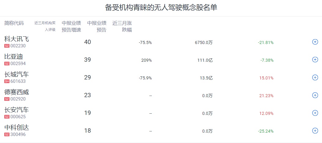 腾讯自选股为您梳理了,近三月以来备受机构青睐的无人驾驶概念股名单,供您参考。其中,科大讯飞最近三个月已经获得40家机构给出了“买入”评级,此外,比亚迪、长城汽车、德赛西威等股亦备受机构青睐。