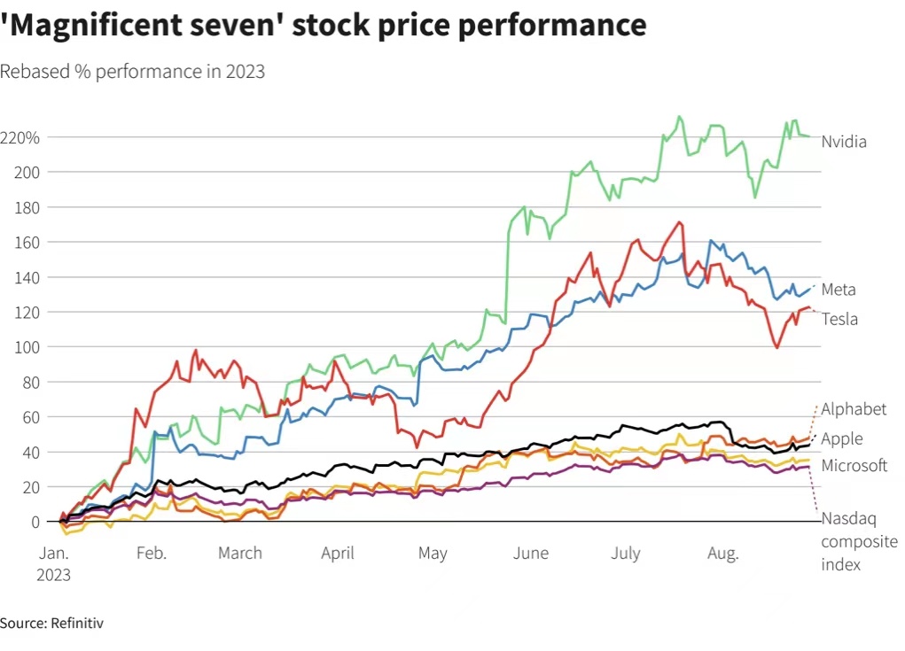 智通财经APP获悉,高盛上周五公布的数据显示,对冲基金对市值最大的七大科技股的敞口达到创纪录水平;而这恰逢上周英伟达(NVDA.US)在营收超出预期后创下历史新高。目前,美国最大的七只股票合计占高盛追踪的对冲基金持有的总净市值的20%左右。这被称为美股科技巨头“七姊妹”也在今年美国股市整体上涨中发挥了重要作用。这些公司的股价今年都上涨了35%以上,涨幅从苹果的38%到英伟达的211%不等。
