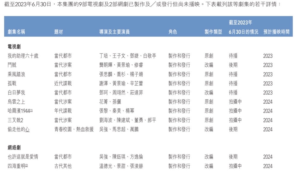 截至2023年6月30日,公司有9部电视剧及2部网剧已制作及╱或发行但尚未播映,其中包括由孙俪主演的悬疑剧《乌云之上》,由张黎导演,王小枪编剧,秦昊、杨幂主演的谍战剧《哈尔滨1944》,由景甜、张凌赫主演的仙侠剧《四海重明》,由陈建斌、董勇、郝平等主演的警侦题材剧《三叉戟2》、由黄景瑜、修睿等主演的警匪动作喜剧《斗贼》;由黄景瑜、辛芷蕾等主演的近代谍战剧《孤战》;由乔杉、杨子姗等主演的当代都市剧《乘风踏浪》;由王子文、邓婕、白敬亭主演的《我的助理六十岁》以及由周翊然、庄达菲主演的青春爱情剧《白日梦我》。此外,由陈钰琪、方逸伦主演的当代都市剧《也许这就是爱情》也已完成拍摄并处于后期制作阶段。