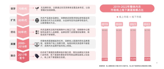 据调研报告显示,伴随我国整体零售业态发展进程,在行业的革新与技术推动下,内衣从传统百货时代逐步迭代至如今的新零售纪元。随着线上流量红利见顶和线下体验刚需价值凸显,在中长期内衣零售渠道将呈现出全渠道融合态势,渠道间资源共享和业务互补并举,服务于消费者的体验融合。