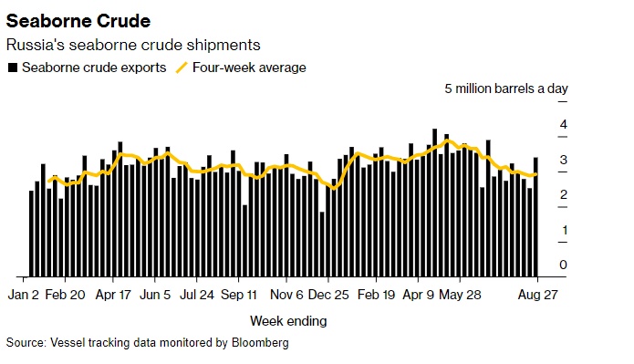 船舶跟踪数据和港口代理报告显示,截至8月27日的一周,共有33艘油轮装载了1.238亿桶俄罗斯原油。这比前一周的数字增加了大约612万桶,是八周以来的最大规模。