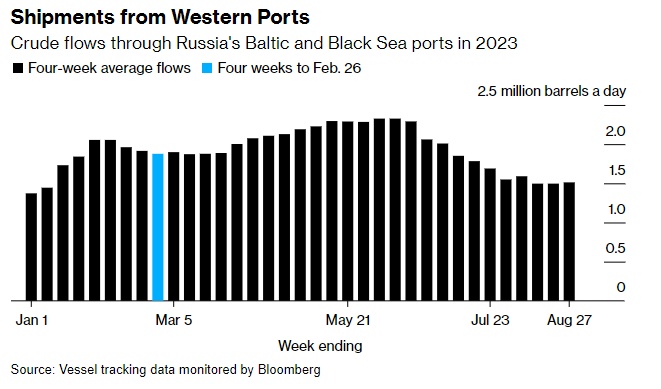 来自西方港口的出货量——在2023年原油流经俄罗斯波罗的海和黑海港口