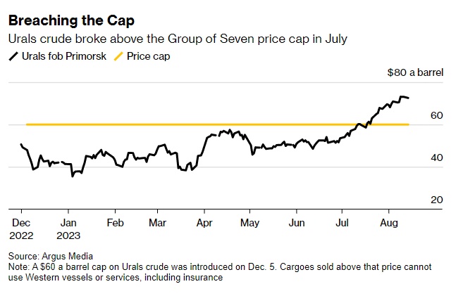 欧佩克+集团中几个主要原油生产国主导的减产措施推高了全球油价基准——布伦特原油价格,并缩小了俄罗斯原油等级相对于全球油价基准的折扣,从而增加了克里姆林宫的石油收入。俄罗斯原油基准——乌拉尔原油价格突破了七国集团(G7)设定的每桶60美元的上限,超过G7规定的这一上限后,西方国家的船只无法运输俄罗斯货物,也无法使用来自西方国家的公司提供的融资或保险等服务。