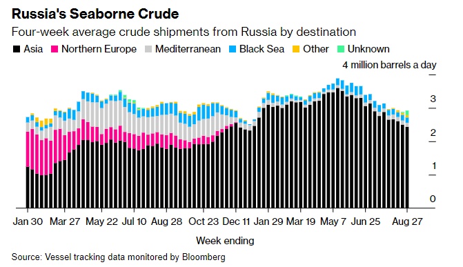 截至8月27日的四周内,机构所汇编的俄罗斯对于亚洲客户(包括没有显示最终目的地的客户)的出货量从截至8月20日期间的每日253万桶小幅上升至每天257万桶。