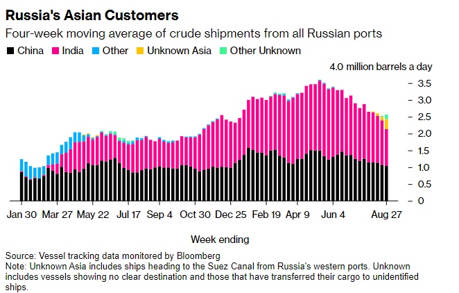 没有显示“初始目的地”的船上的大部分货物最终都会到达印度。即便如此,运往已成为俄罗斯海运原油最大买家的国家的运输数量仍较近期高点有所下降。将“未知亚洲”和“其他未知”产量添加到印度总量中,截至8月27日的四个星期内,该数值为每天153万桶,低于截至5月21日当周期间每日215万桶的高位日产量,但高于截至8月20日期间的每日145万桶。