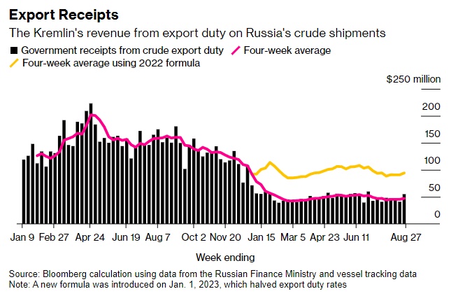 在截至8月27日的七天内,从原油出口关税中流入克里姆林宫资金的资金猛增至5,500万美元,增加了1,400万美元,增幅达35%。四周的平均收入上升到大约4700万美元。