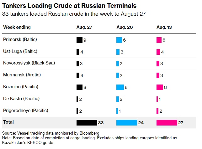 油轮在俄罗斯码头装载原油——在截至8月27日的一周内,33艘油轮装载了俄罗斯原油