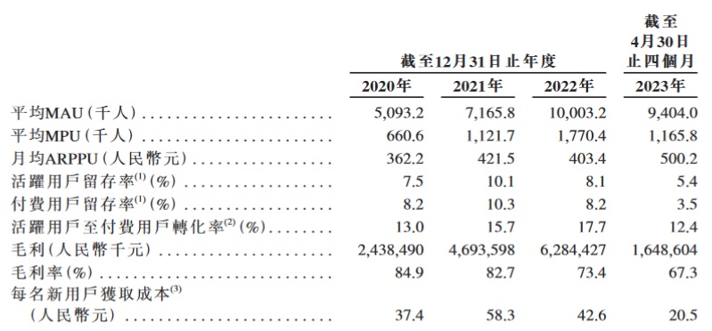 截至2023年4月30日止四个月,中旭未来营销及运营的游戏产品的平均月活跃用户(MAU)约达9400万名。于往绩记录期,公司营销及运营的所有游戏产品的每名付费用户平均月收入(ARPPU)为人民币411.1元。除游戏产品外,公司亦提供有关网络文学产品的营销服务。