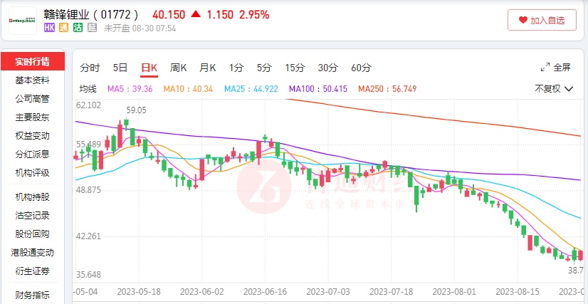 二级市场方面,赣锋锂业股价自1月27日创下75.312港元/股的阶段性高点以来,持续下跌,截止8月29日收盘,报40.15港元/股,期间累计跌幅接近50%。