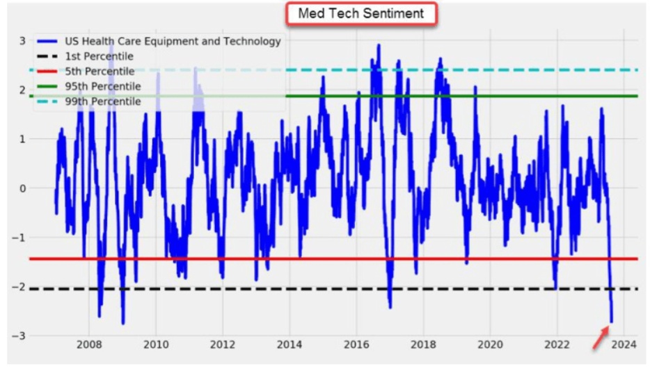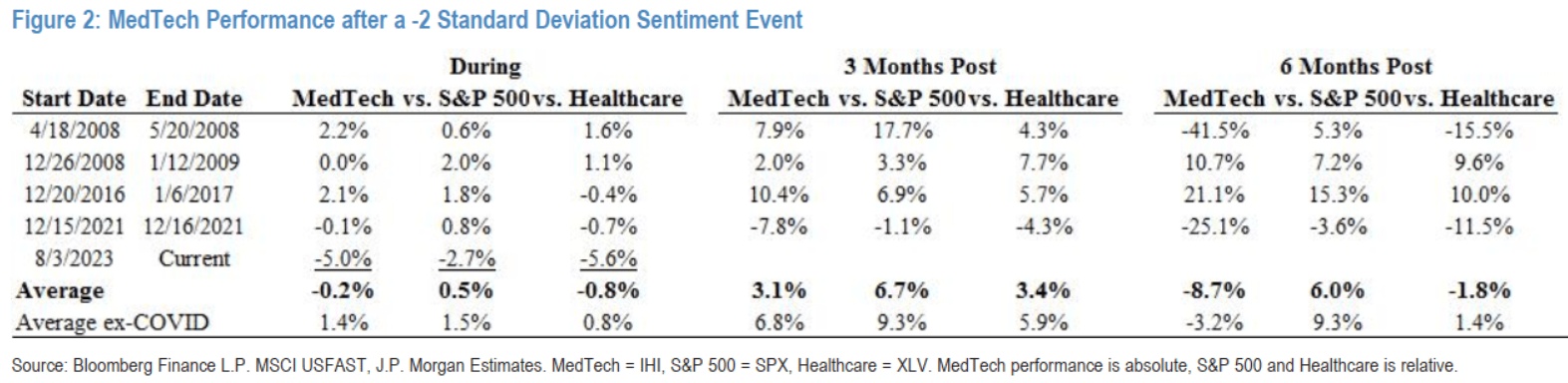 摩根大通分析师Robbie Marcus指出,医疗科技股目前处于2008/09年金融危机以来的最低情绪水平,即负2.5个标准差。Marcus发现,医疗科技股在过去达到负2个标准差后的3个月、6个月和1年期间平均表现优异,现在也是如此。