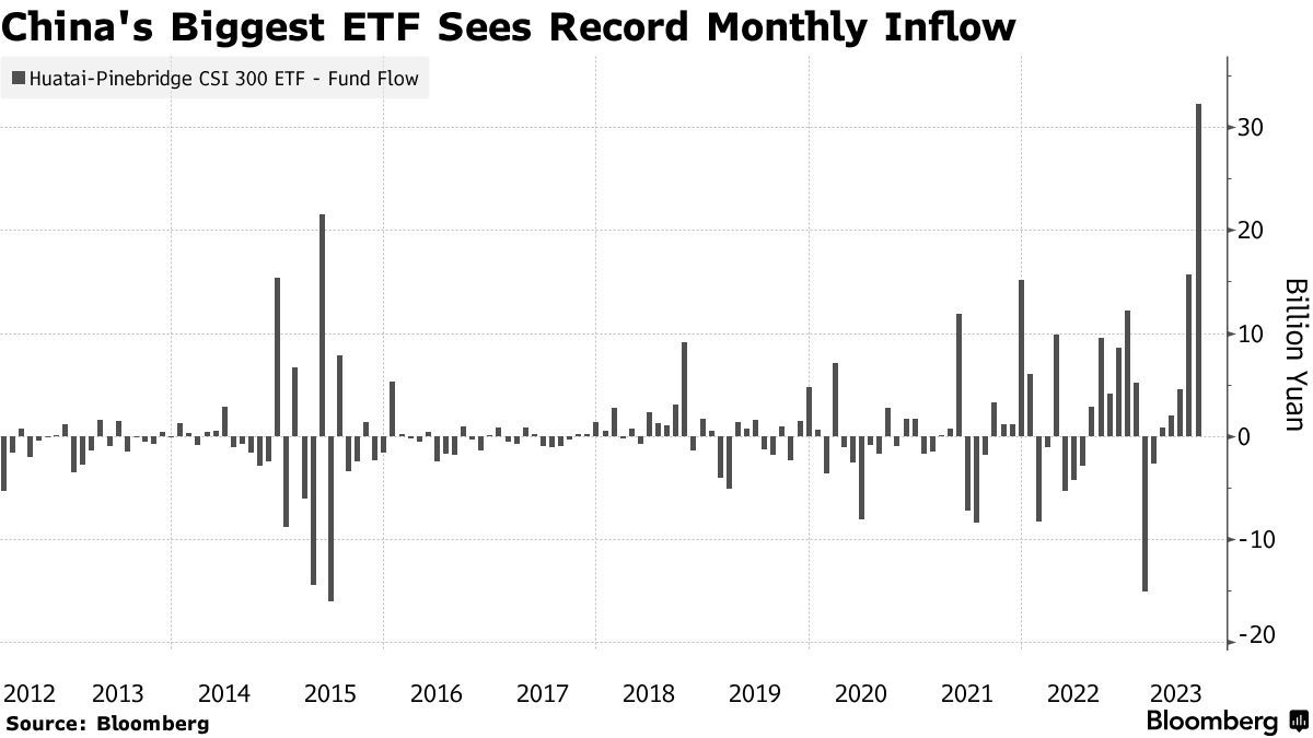智通财经APP获悉,中国最大的股票型交易所交易基金(ETF)将迎来有记录以来最大规模的月度资金流入。这一迹象表明,一些投资者正在逢低买入,押注政策支持力度加大之际股市将出现转机。数据显示,8月份迄今为止,华泰柏瑞沪深300ETF已有320亿元人民币的资金流入,这是该产品自2012年推出以来最高的。