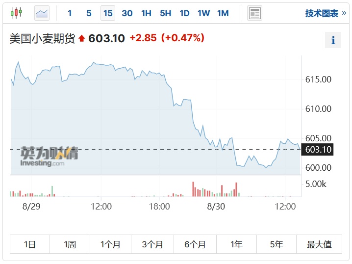 智通财经APP获悉,周三,小麦期货价格从6月初以来的最低水平上涨,原因是俄乌双方在黑海区域再次发生冲突。截至发稿,芝加哥小麦期货涨0.47%,报每蒲式耳6.031美元;该期货在过去四个交易日跌超6%。