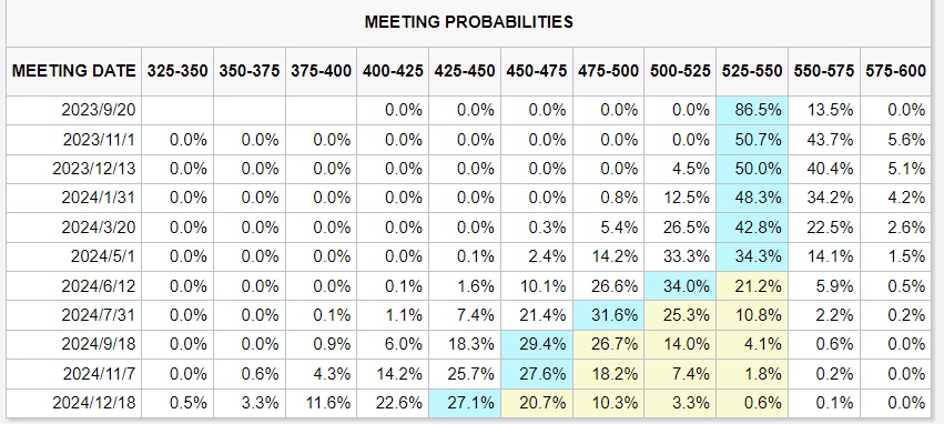 利率期货市场的预期数据方面,CME“美联储观察工具”显示,与多数经济学家观点一致,利率期货交易员们普遍押注美联储本轮加息周期已经完结。此外,交易员中的绝大多数人同样预计美联储将于明年6月开始降息,但是,多数利率期货交易员预计明年降息幅度将达到100个基点。