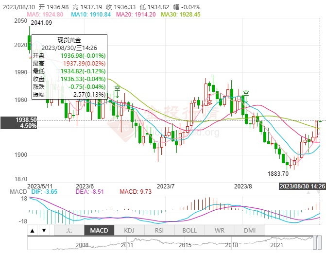 智通财经APP获悉,随着投资者因经济数据疲弱而减少对美国进一步升息的押注,周三,金价徘徊在三周高位附近。截至发稿,现货黄金持平于每盎司1936.25美元,较周二触及的8月7日以来最高水准低约2美元。美国黄金期货稳定在每盎司1,964.20美元。