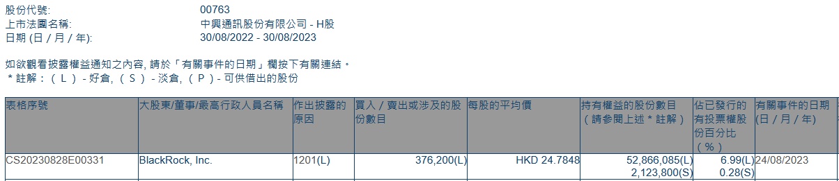 智通财经APP获悉,香港联交所最新资料显示,8月24日,贝莱德减持中兴通讯(00763)37.62万股,每股作价24.7848港元,总金额约为932.40万港元。减持后最新持股数目约为5286.61万股,最新持股比例为6.99%。