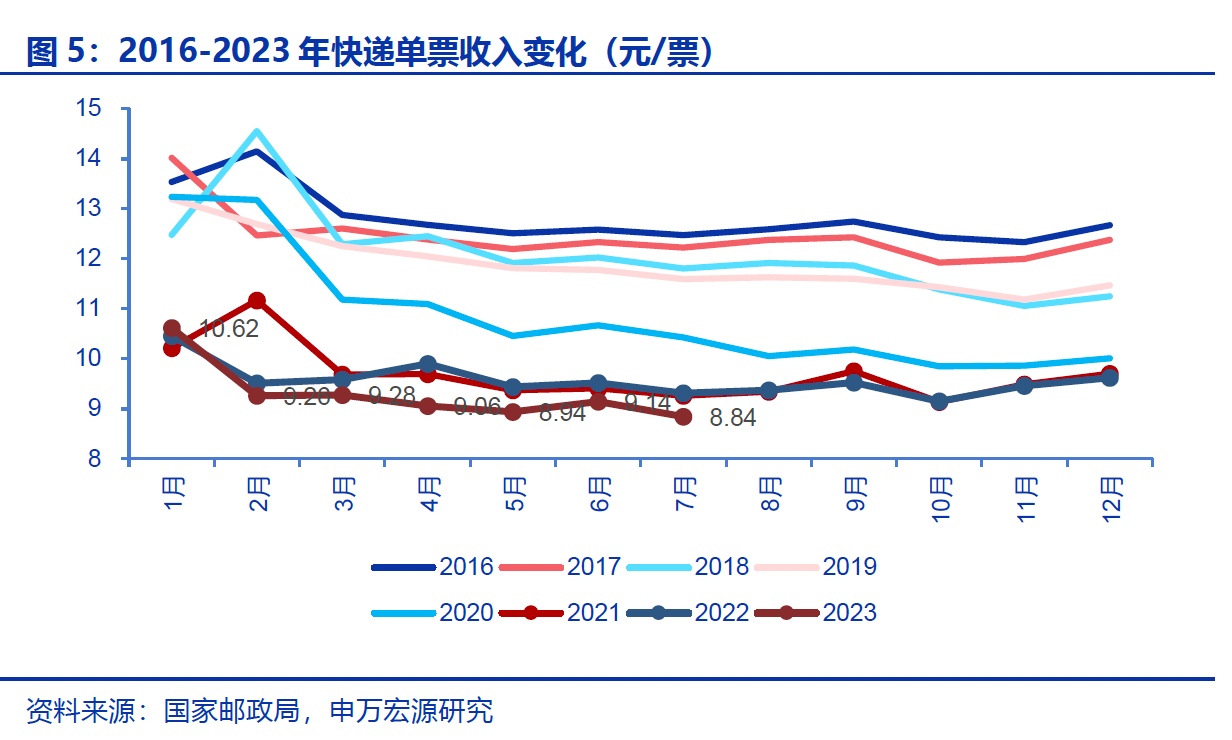回溯国内快递市场的价格表现,受到疫后物流节点恢复流通,成本端油价震荡下跌,以及快递件量增长等多重因素影响,终端价格有所承压。数据显示,今年前7月快递单票收入整体较往年同期为低,这表明行业竞争烈度仍在上升。