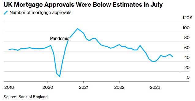 数据显示,7月份银行和建筑协会批准了49,444笔住房贷款,为2月份以来的最低水平,低于6月份的54,605笔。经济学家原本预计的下降幅度较小,为5.1万人。