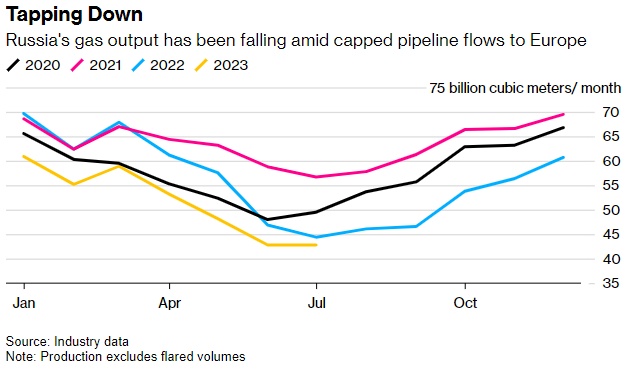 由于输往欧洲的管道流量受到限制,俄罗斯的天然气产量一直在下降