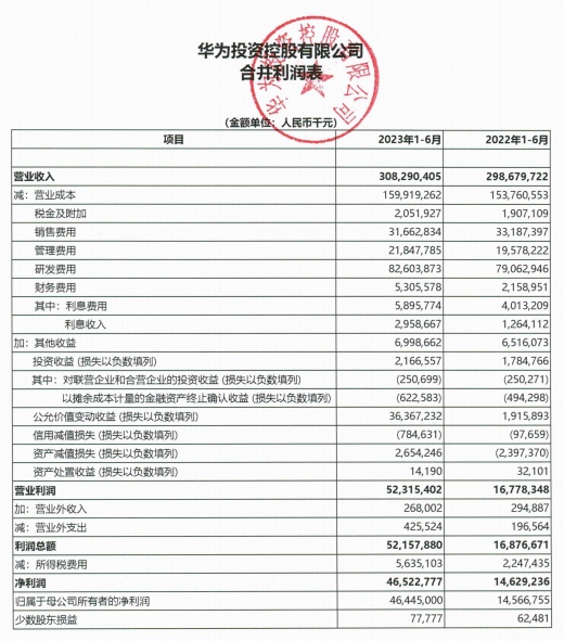智通财经APP获悉,8月30日,华为在上清所官网披露2023年半年报。上半年,华为实现营收3082.90亿元,上年同期为2986.80亿元;净利润为465.23亿元,上年同期为146.29亿元,同比增长218%。华为持续投入研发,2023年上半年,华为研发费用为826.04亿元,同比增加35.41亿元,上年同期为790.63亿元。