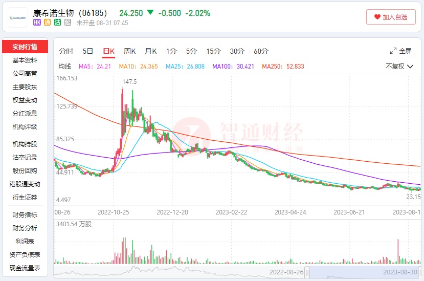 二级市场方面,自2022年底新冠疫情影响逐渐降低以来,康希诺股价一路走低。从2022年11月的高点147.5港元跌至近期最低价23.95港元,股价已经跌超80%。