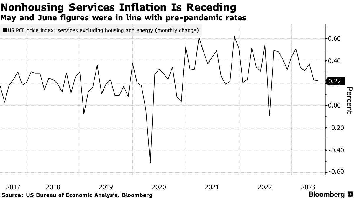 经济学家Stuart Paul、Anna Wong和Eliza Winger表示,鲍威尔偏爱的通胀指标——超级核心通胀——可能在7月加速,除非政策制定者看透加息的不稳定驱动因素,否则美联储在11月再次加息的可能性或许会增加。